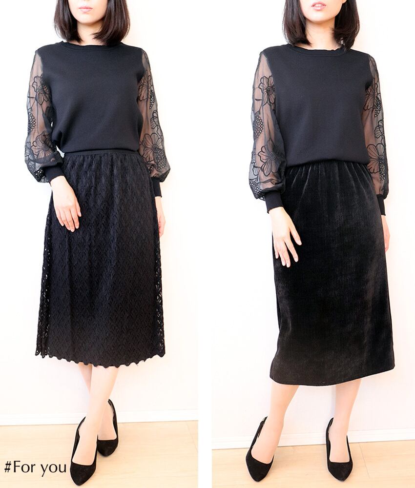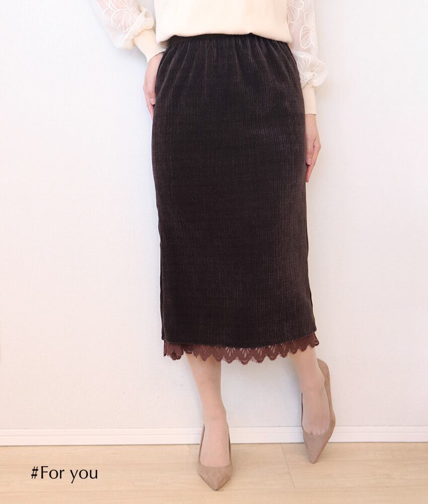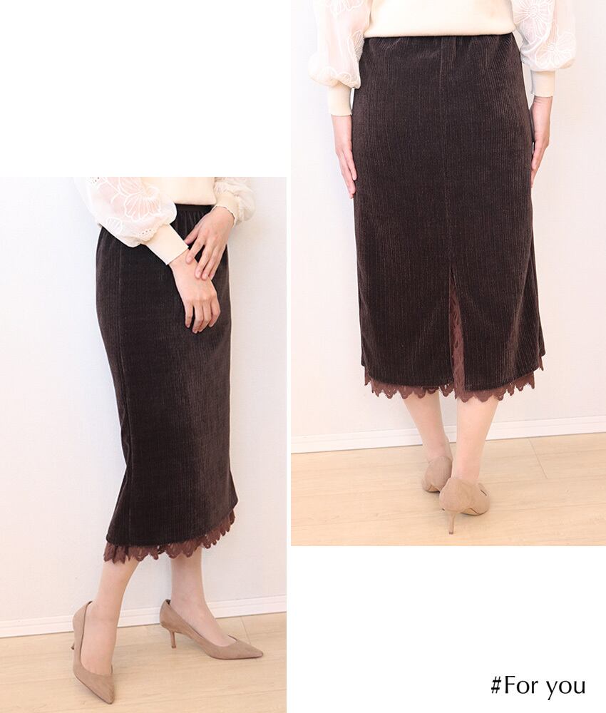 二面性を持つリバーシブルスカート。コーデュロイのニットと、花柄レースを使い分けることができるお得スカートです。裾のスリッドもオシャレポイントです。