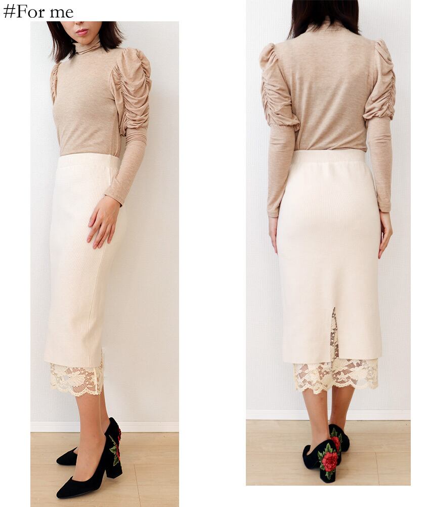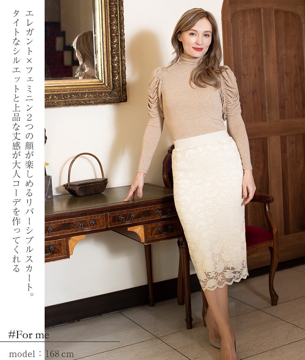 リバーシブルで華やかにもシックにも着こなせるニットスカート。さりげなく入った後ろのスリットもポイント。