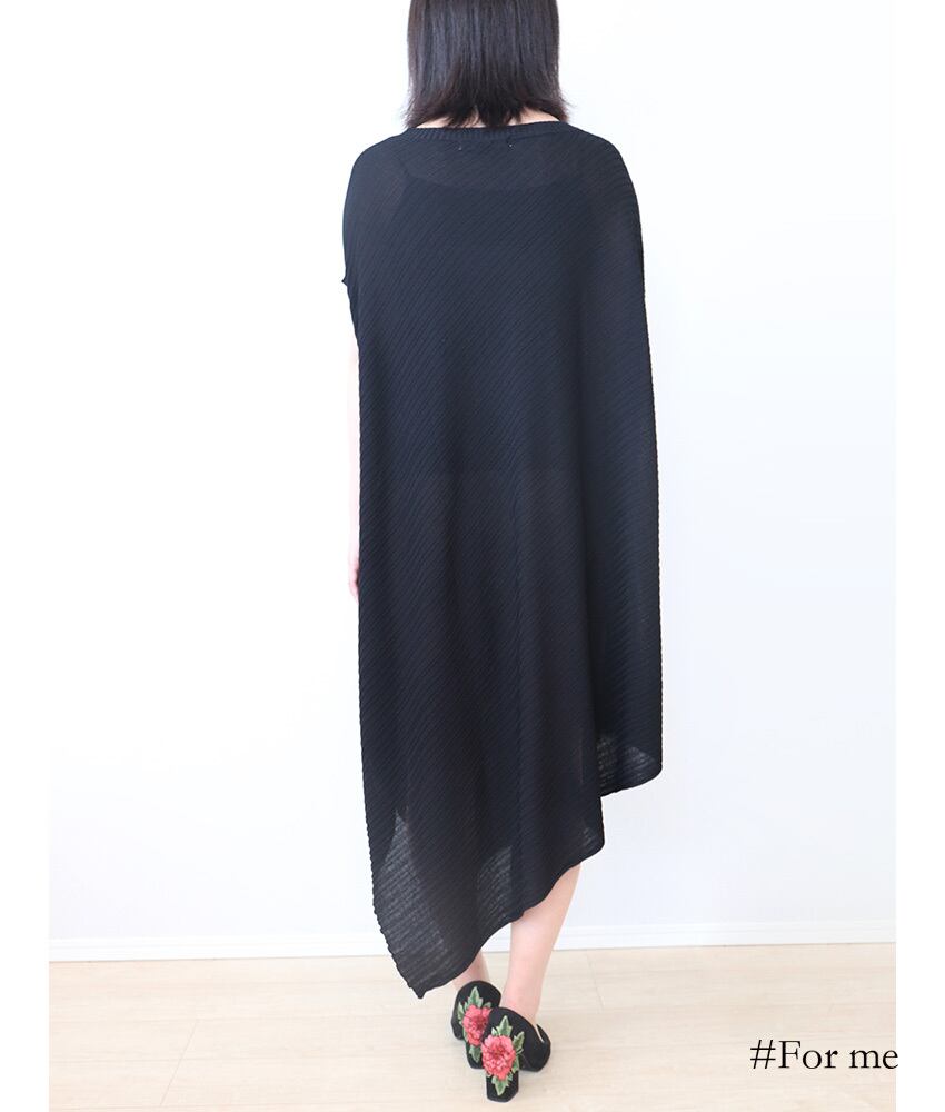 涼し気な素材で伸縮性があるワンピース。アシンメトリーでオシャレなスタイルに。ゆったりとしていて体型カバーにもなります。