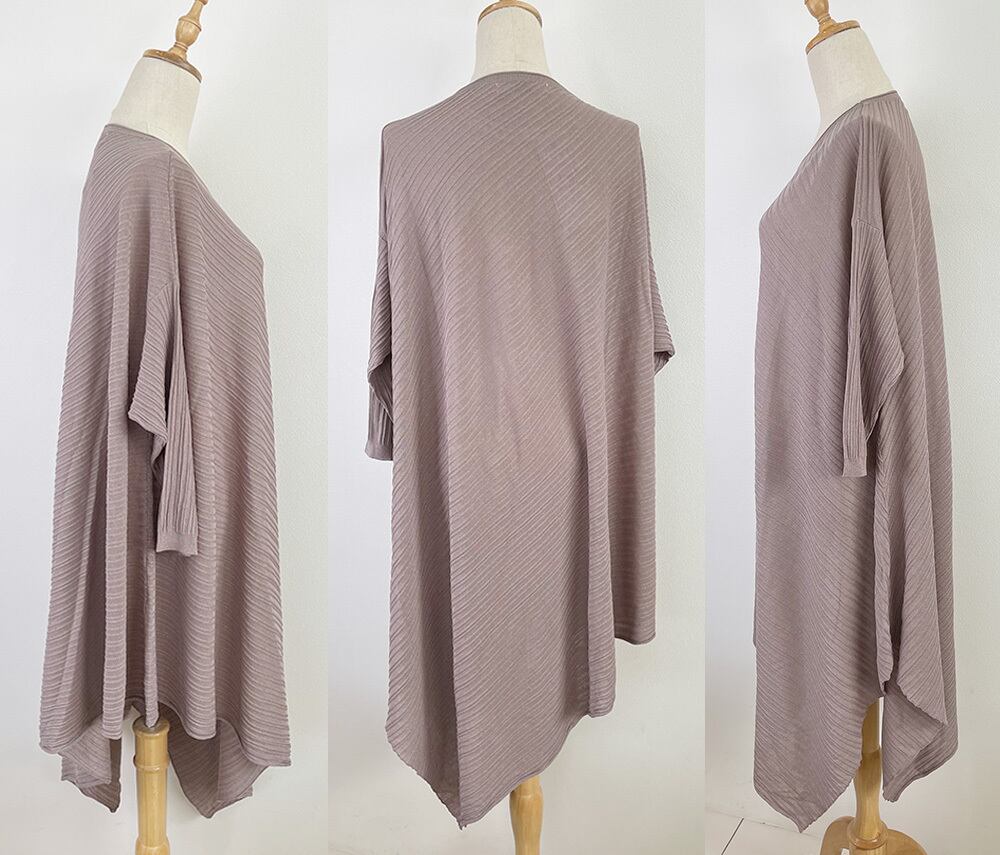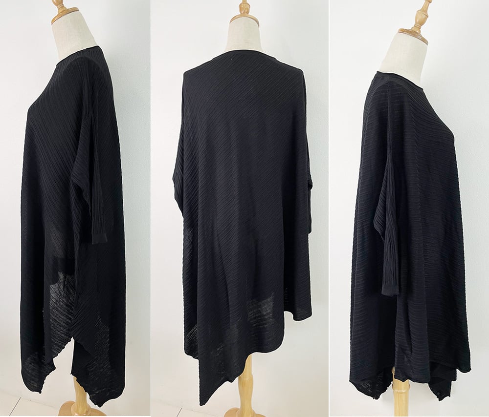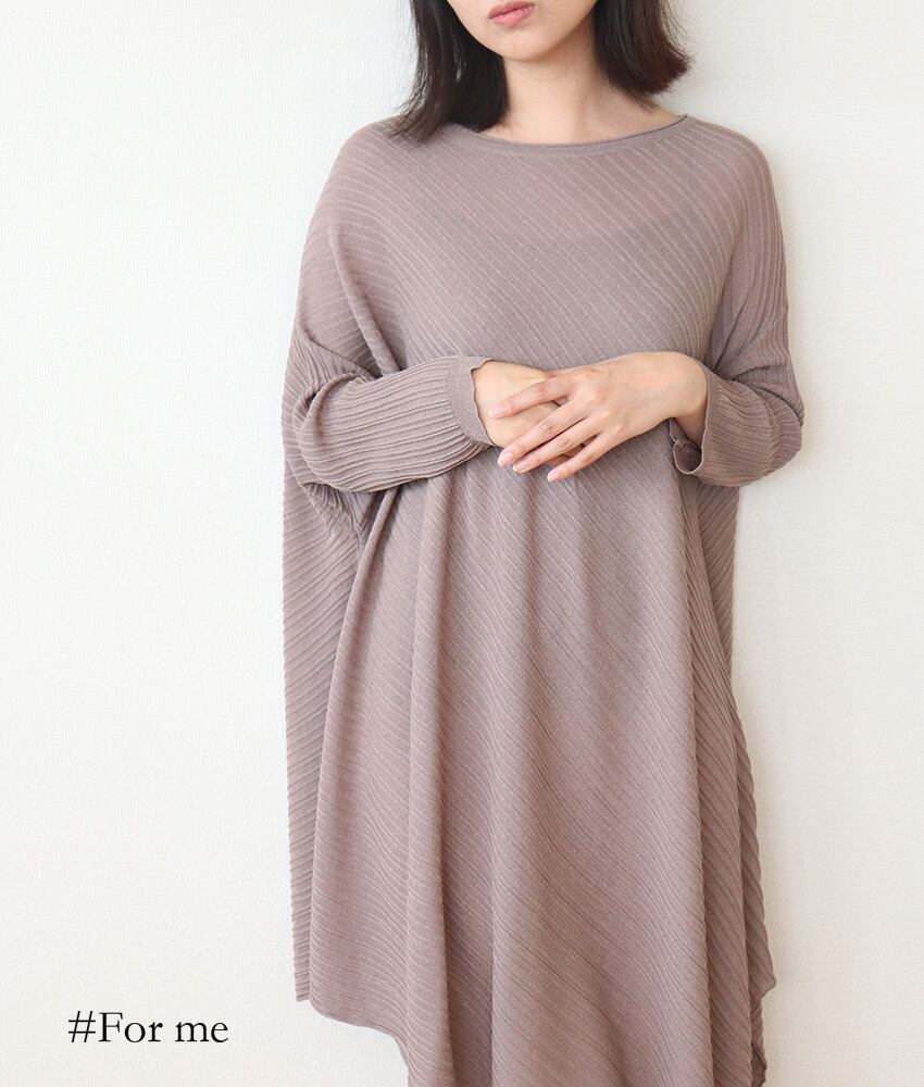 涼し気な素材で伸縮性があるワンピース。アシンメトリーでオシャレなスタイルに。ゆったりとしていて体型カバーにもなります。