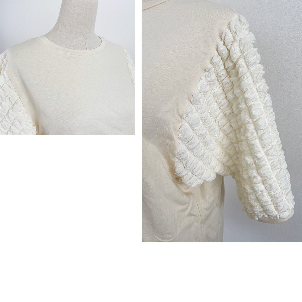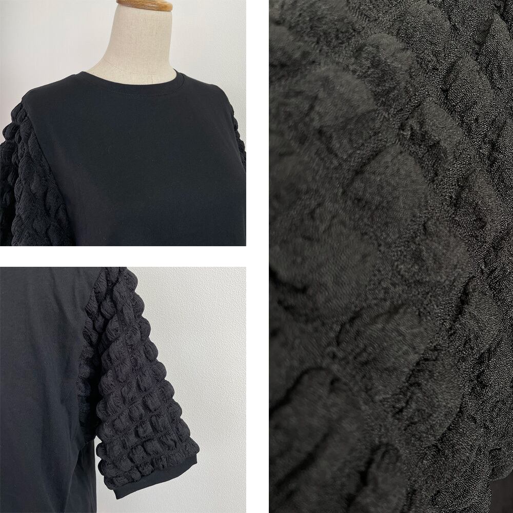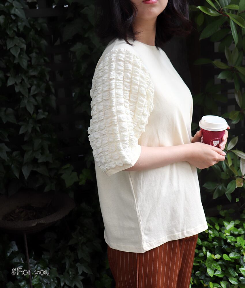 袖がモコモコした柔らかい印象のトップス。他にはないデザインが嬉しい!五分袖なので、腕カバーにもなります。ゆったりと着用できます。